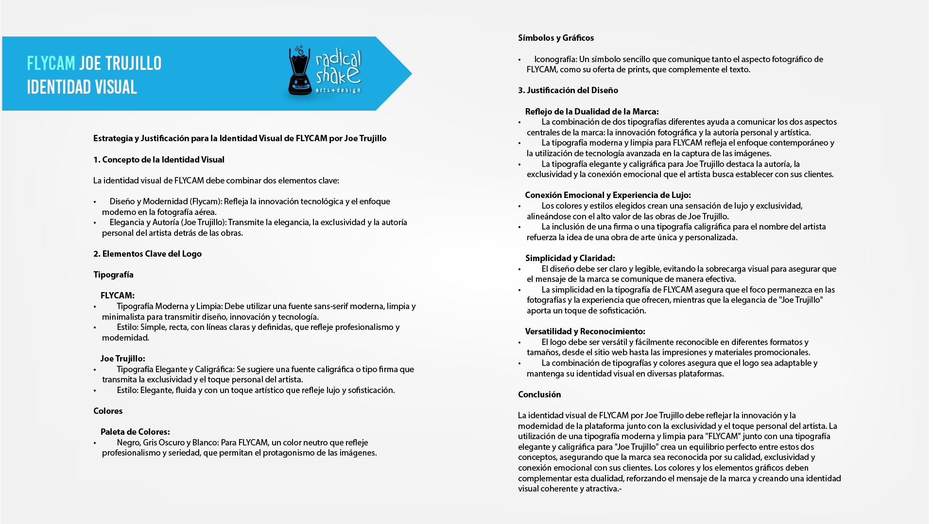 Flycam es la marca creada por el fotógrafo Joe Trujillo para comercializar su trabajo de fotografía aérea artística, enfocada en la decoración de interiores y proyectos creativos. El desafío fue transformar una firma personal en una marca con identidad sólida, coherente y competitiva dentro del mercado artístico y de diseño.
